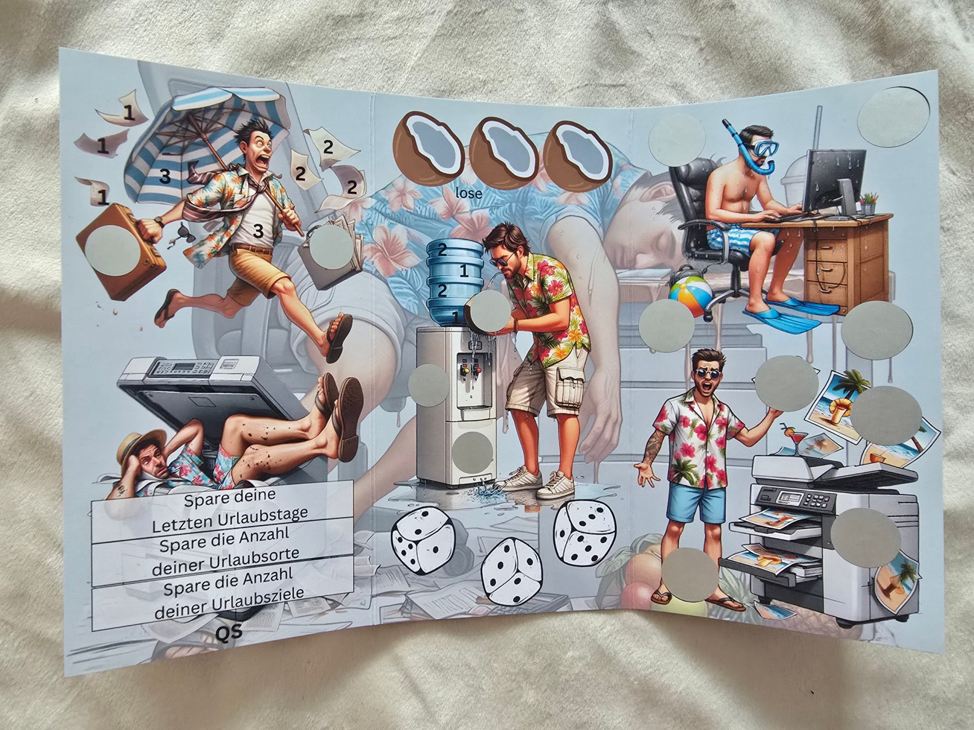 Bei mitgelieferten Kleinteilen wie z.b. Würfel, Lose, Rubbelhilfen, Plastikverpackungen, Büroklammern besteht Erstickungsgefahr sowie Gefahr sich zu verschlucken, stechen oder zu schneiden.