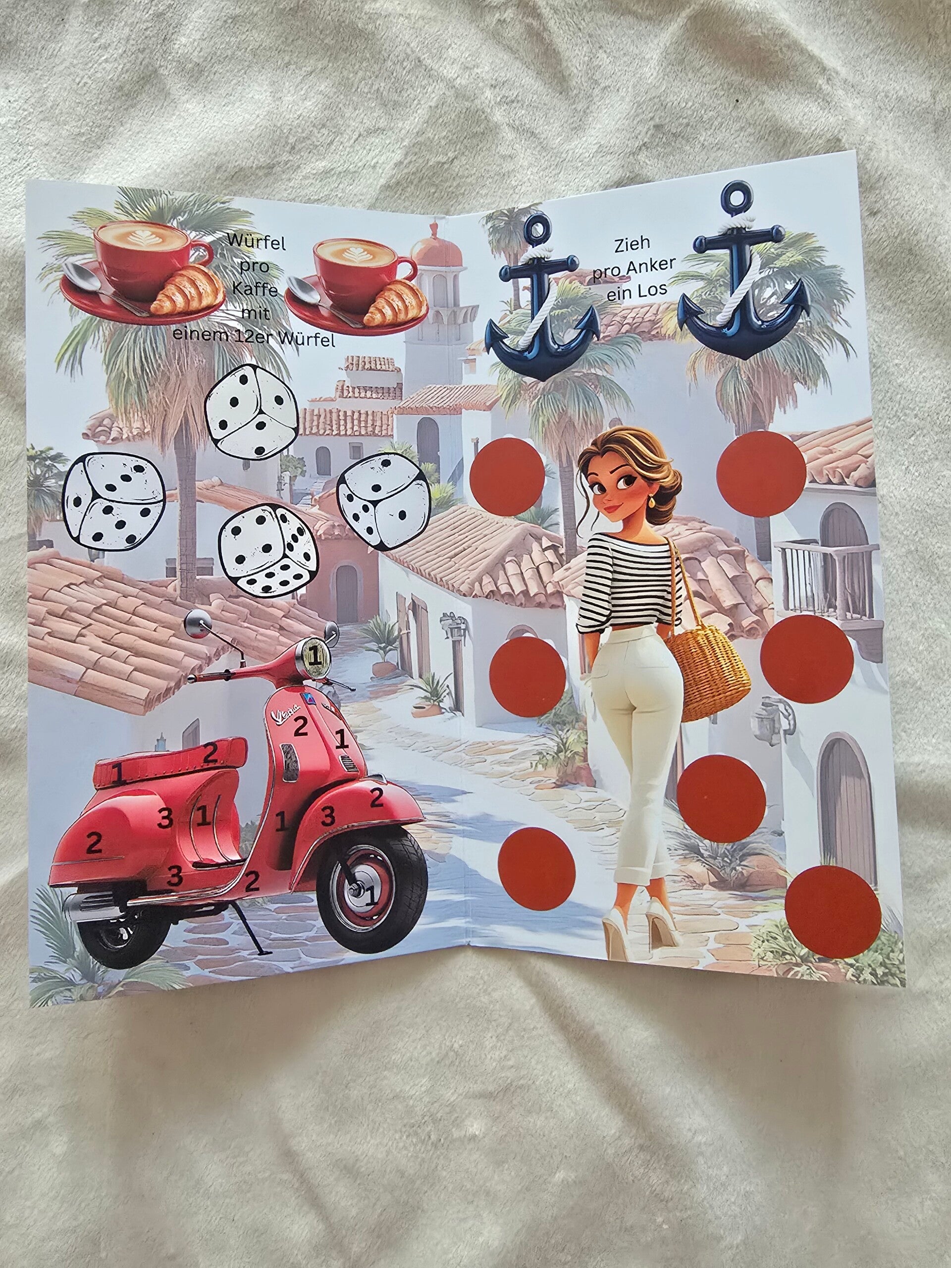 Bei mitgelieferten Kleinteilen wie z.b. Würfel, Lose, Rubbelhilfen, Plastikverpackungen, Büroklammern besteht Erstickungsgefahr sowie Gefahr sich zu verschlucken, stechen oder zu schneiden.