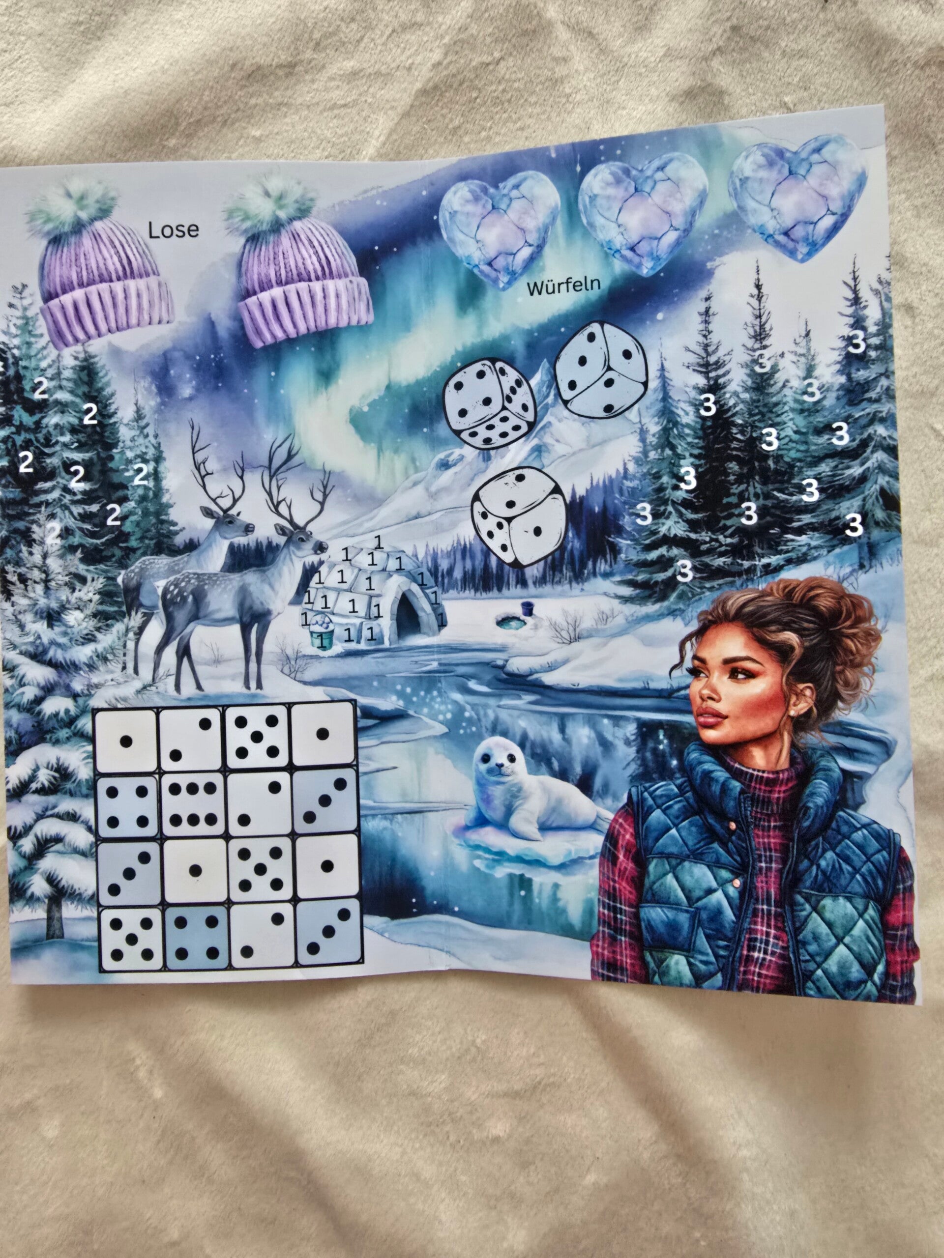 Bei mitgelieferten Kleinteilen wie z.b. Würfel, Lose, Rubbelhilfen, Plastikverpackungen, Büroklammern besteht Erstickungsgefahr sowie Gefahr sich zu verschlucken, stechen oder zu schneiden.