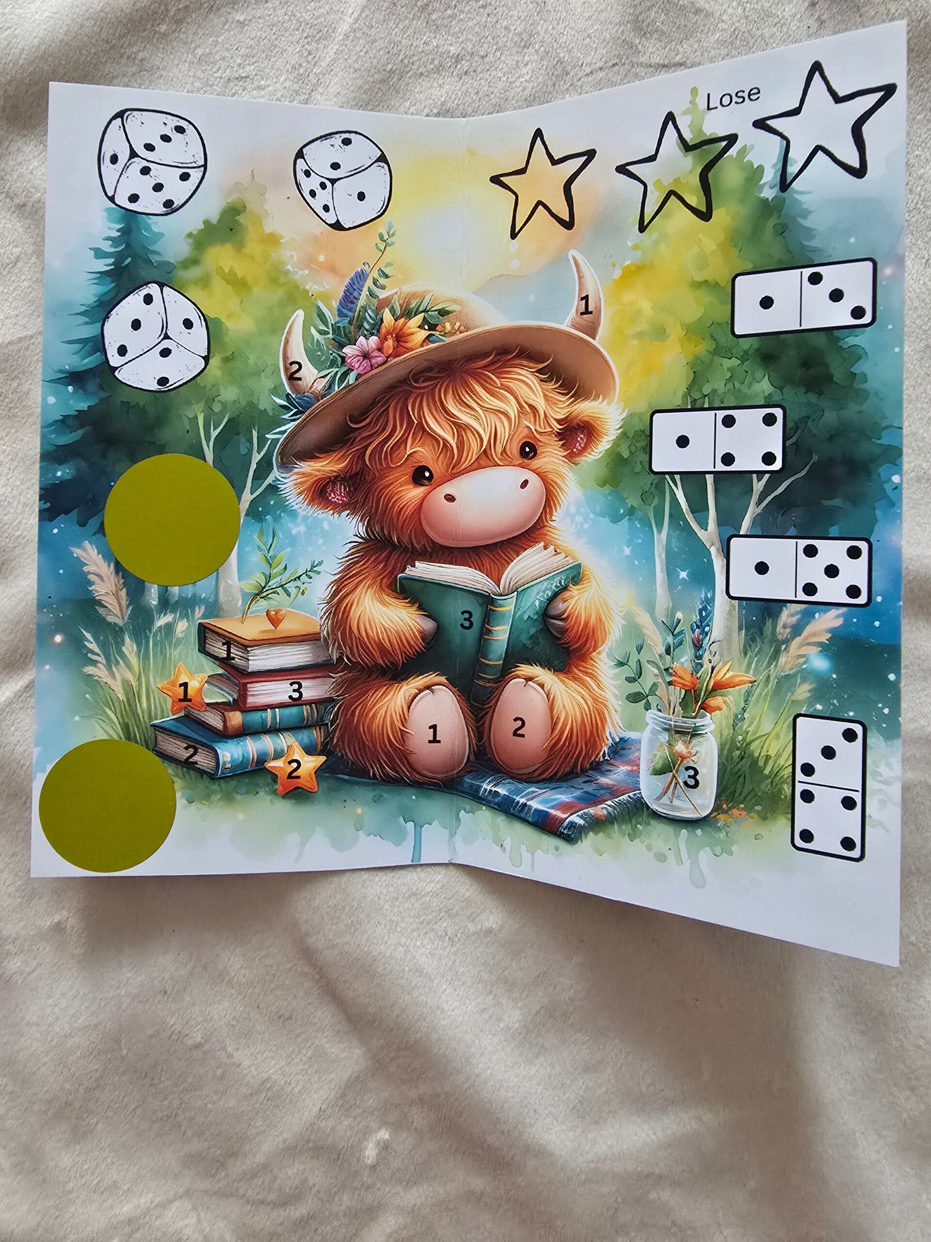 Bei mitgelieferten Kleinteilen wie z.b. Würfel, Lose, Rubbelhilfen, Plastikverpackungen, Büroklammern besteht Erstickungsgefahr sowie Gefahr sich zu verschlucken, stechen oder zu schneiden.
